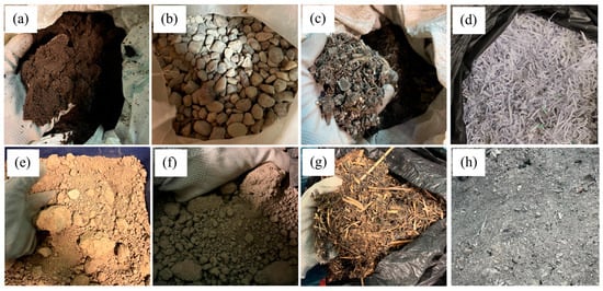 Materials used for the development of biocovers. (a) Stabilized compost; (b) gravel (0–20 mm); (c) fine-fraction waste; (d) shredded paper; (e) clay soil; (f) chernozem; (g) dried algae; (h) ash.