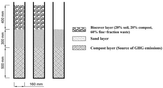 The first phase began on 6 June 2022, with three columns. The biocover composition was 60% fine-fraction waste, 20% clay soil, and 20% stabilized compost. Two columns included biocovers, while one served as a control without a biocover. A total of 41 measurements per column, 123 measurements in total, were taken between 27 June 2022 and 1 September 2023. A graphical representation of the tube columns produced in the experiment can be seen in Figure 2.