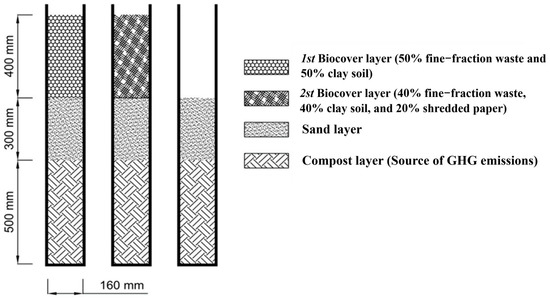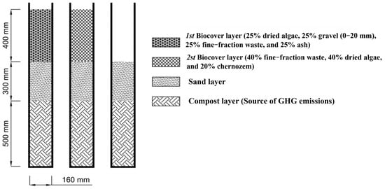 In the present study, the biocover components—fine-fraction waste, clay soil, stabilized compost, shredded paper, dried algae, gravel, ash, and chernozem—were selected based on prior findings regarding their suitability for enhancing methane oxidation and maintaining structural stability under landfill conditions [4,5,6,7,8]. The controlled laboratory experiment was designed to systematically evaluate different material combinations for their effect on CH4, CO2, and N2O emissions, generating data that can inform the optimization of landfill biocover design for climate change mitigation.