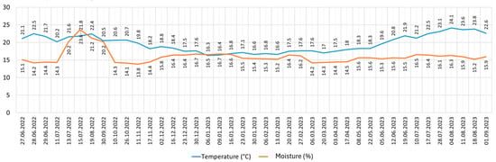 Soil moisture and temperature were recorded immediately before each gas sampling using a moisture probe and a temperature sensor inserted into the biocover layer at consistent depths. The measurements confirmed that both parameters remained uniform across all biocover compositions, ensuring comparability between experimental setups (Figure 5). This controlled approach allowed for an accurate evaluation of biocover performance in mitigating GHG emissions without significant variability in environmental conditions.