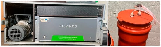 Emission assessments were conducted three weeks after the biocover installation to allow for settling and stabilization. GHG emissions were measured using the Picarro G2508 [13] (see Figure 6). Emissions were measured both from biocover systems and from control columns without biocovers to assess the reduction in emissions attributable to the biocovers. For each experimental phase, the three columns were measured on the same day with a 1 min interval between columns. Measurements for all phases were carried out weekly starting from the beginning of the measurement period.