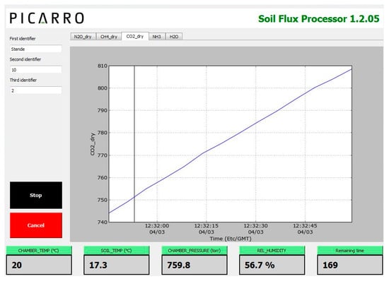 During the measurements, a closed environment was ensured by covering the experimental columns with an insulated lid equipped with two pipes—one for air intake and one for air discharge (see Figure 6). The Picarro G2508 measured GHG concentrations from the columns at an airflow rate of 5 mL s−1. Each experimental column was measured for 250 s, and data were analyzed using the Soil Flux Processor 1.2.05, which displayed the GHG emissions at the end of each measurement [13]. The selected measurement duration was based on previous studies [14,15], where similar time intervals were found to provide stable concentration–time trends and reliable flux calculations.