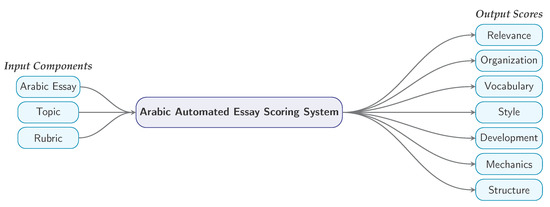 - Alfarah, Z.; Habash, N.; Saddiki, H. ARAScore: Holistic and Analytic Scoring for Arabic Essays. In Proceedings of the WANLP, Kyiv, Ukraine, 19 April 2021; pp. 78–92. [Google Scholar]