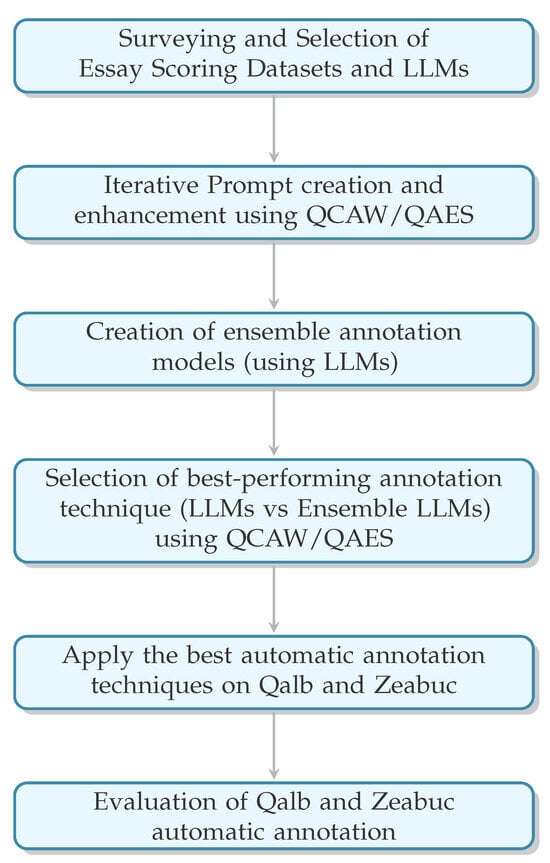 This section details the systematic approach used to develop a robust Arabic AES framework. As presented in Figure 1, the overall architecture highlights the system’s input components and the output scoring traits. The overarching workflow progresses from initial data acquisition to the final annotation of new corpora, providing a clear roadmap for the entire process, as illustrated in Figure 2. Specifically, the methodology encompasses several key stages: (i) surveying and selecting appropriate datasets and LLMs, (ii) iteratively creating and enhancing prompts for AES, (iii) developing ensemble annotation models using LLMs, (iv) selecting the best-performing annotation technique by comparing direct LLM outputs and ensemble models against expert ratings, and (v) applying and evaluating these techniques to new Arabic corpora. The ultimate goal is to expand Arabic AES resources through a reproducible and cost-effective process, with each stage further elaborated upon in the subsequent subsections.