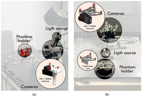 In Phantom v1, the hyperspectral camera was introduced into the tracking system through the Azure Kinect RGB camera, using the extrinsic parameters between the two devices, which remained stable due to the rigid, 3D-printed mounting structure. In Phantom v2, the calibration workflow was modified to allow for the direct integration of the hyperspectral camera into the tracking system, eliminating any dependency on other cameras. The methodology used to acquire the data also differs among the phantom versions as depicted in Figure 4.