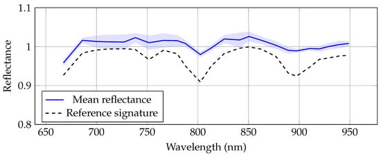 Mean spectral signature of the reference polymer obtained with the hyperspectral camera across different exposure times (solid blue line), with the shaded area representing the standard deviation. The dotted line shows the reference spectrum provided by the manufacturer.
