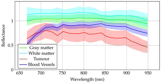 Furthermore, using the labeled hyperspectral images, the mean and standard deviation for each tissue class were computed across different exposure times in Phantom v2, as illustrated in Figure 10. The results show that the spectral signatures of the different tissues are distinct, making them suitable for use in classification algorithms. Since the primary application of hyperspectral images of these phantoms is tumor detection, the similarity between the white and gray matter signatures is intentional, allowing these tissues to be combined into a single healthy class for classification purposes, as done in the phantom labels.