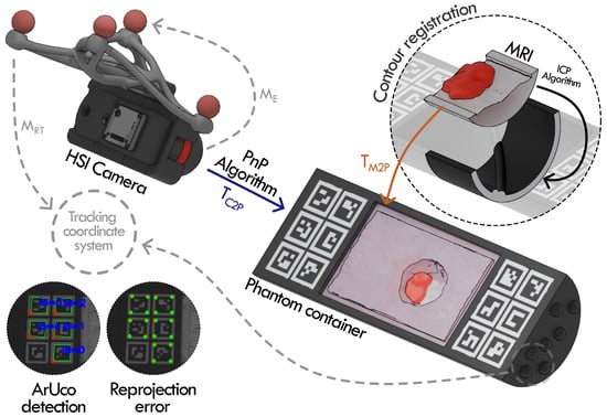 To register the multimodal information provided in the dataset, one of the approaches is to use only the HSI camera, the MRI, and the 3D model of the phantom container. A schematic representation of this process is shown in Figure 11.