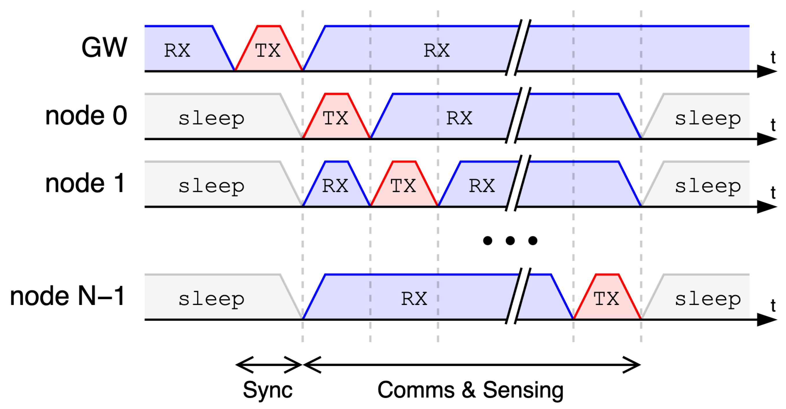 The gateway has two main tasks in the network: The first is sending a coordination “start message”. The start message has the purpose of performing the ad hoc synchronization in the DASH7 network. The nodes will listen in a low-power background mode for the start message. As all nodes receive this message and know their own node ID, they can calculate in which time slots they have to listen for messages of other nodes and in which time slot they have to transmit. The cycle is visually shown in
