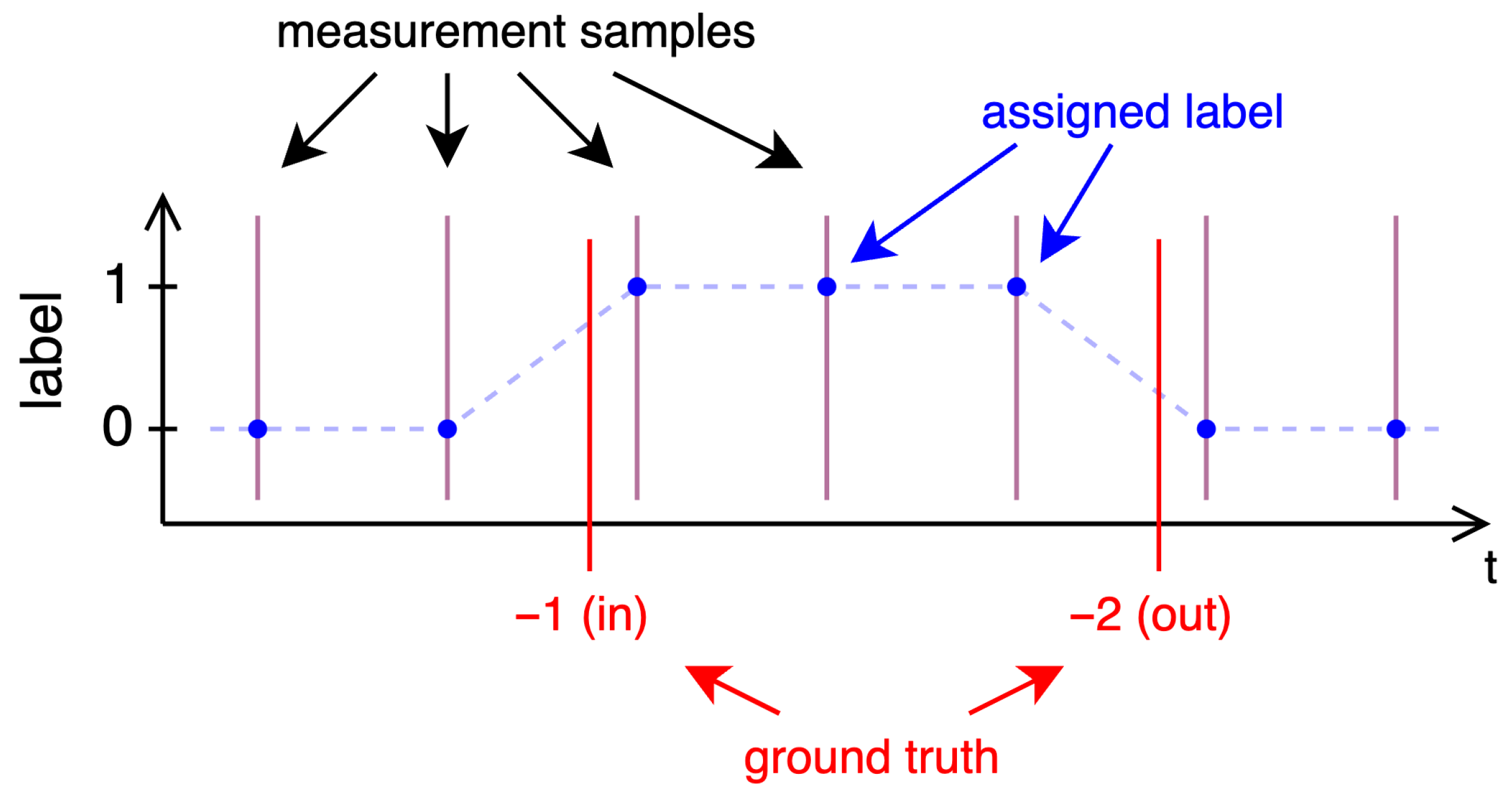 In contrast, vehicle ground truth data can be considered as a time span given by a start and end time. We want to label measurement samples with whether or not a rail vehicle was present for use later to train and evaluate a binary classification model. Thus, we can label more than only the nearest sample. We label all measurement samples between the first and last ground truth value. After a vehicle enters the station, we label all subsequent measurements as “present” or 1 until the vehicle leaves the station. Similarly, when a vehicle leaves the station, we label all subsequent measurements as “not present” or 0 until another vehicle enters the station. This process is visually depicted in