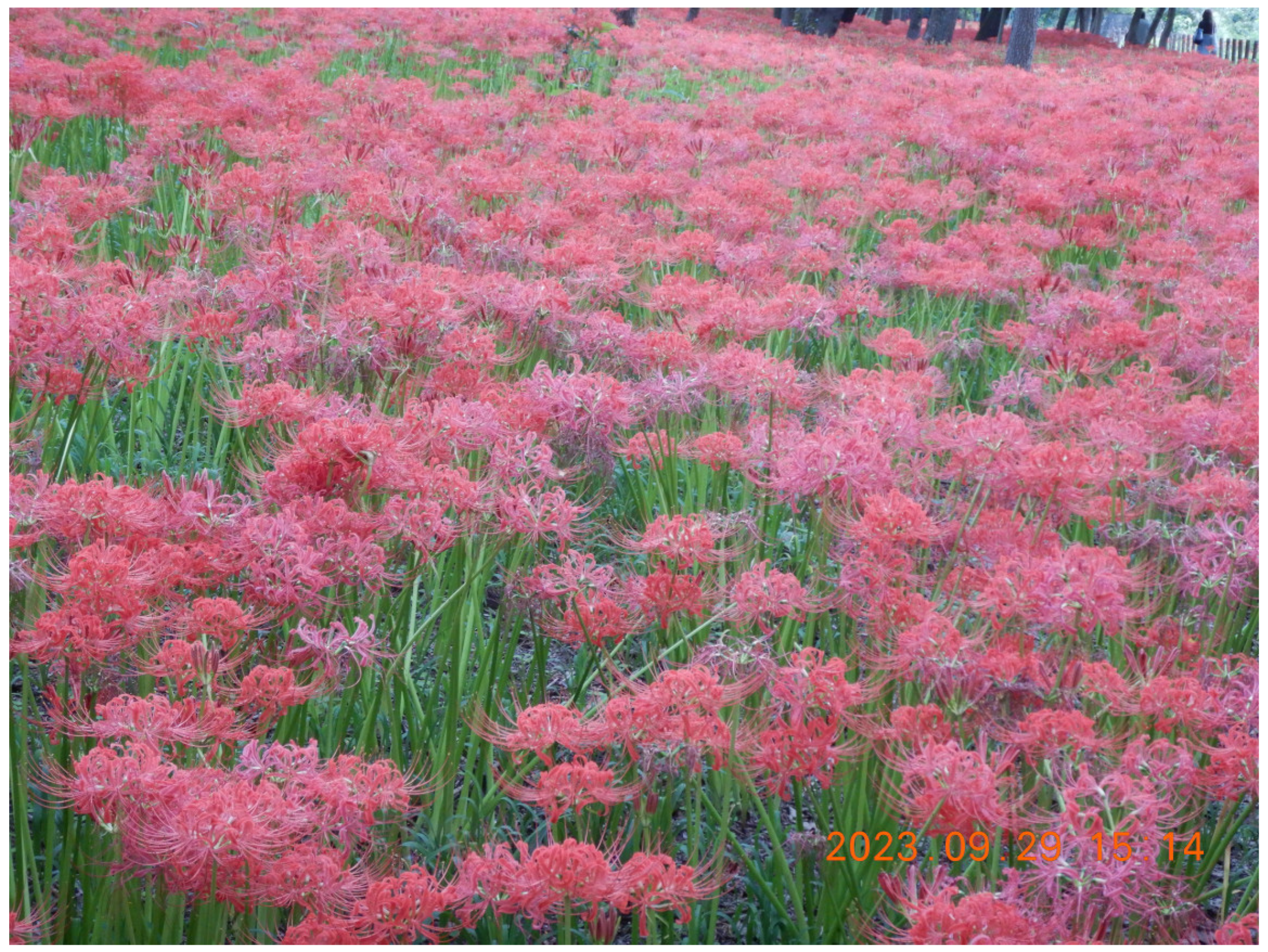 - Shinbun, S. 5 Million Red Spider Lilies Blooming in Kinchakuda Manjyushage Park, Hidaka. A Spectacular Red Carpet. Due to the Intense Heat, Flowering was Delayed About 10 Days. 2024. Available online: https://www.saitama-np.co.jp/articles/103157 (accessed on 3 December 2025). (In Japanese).