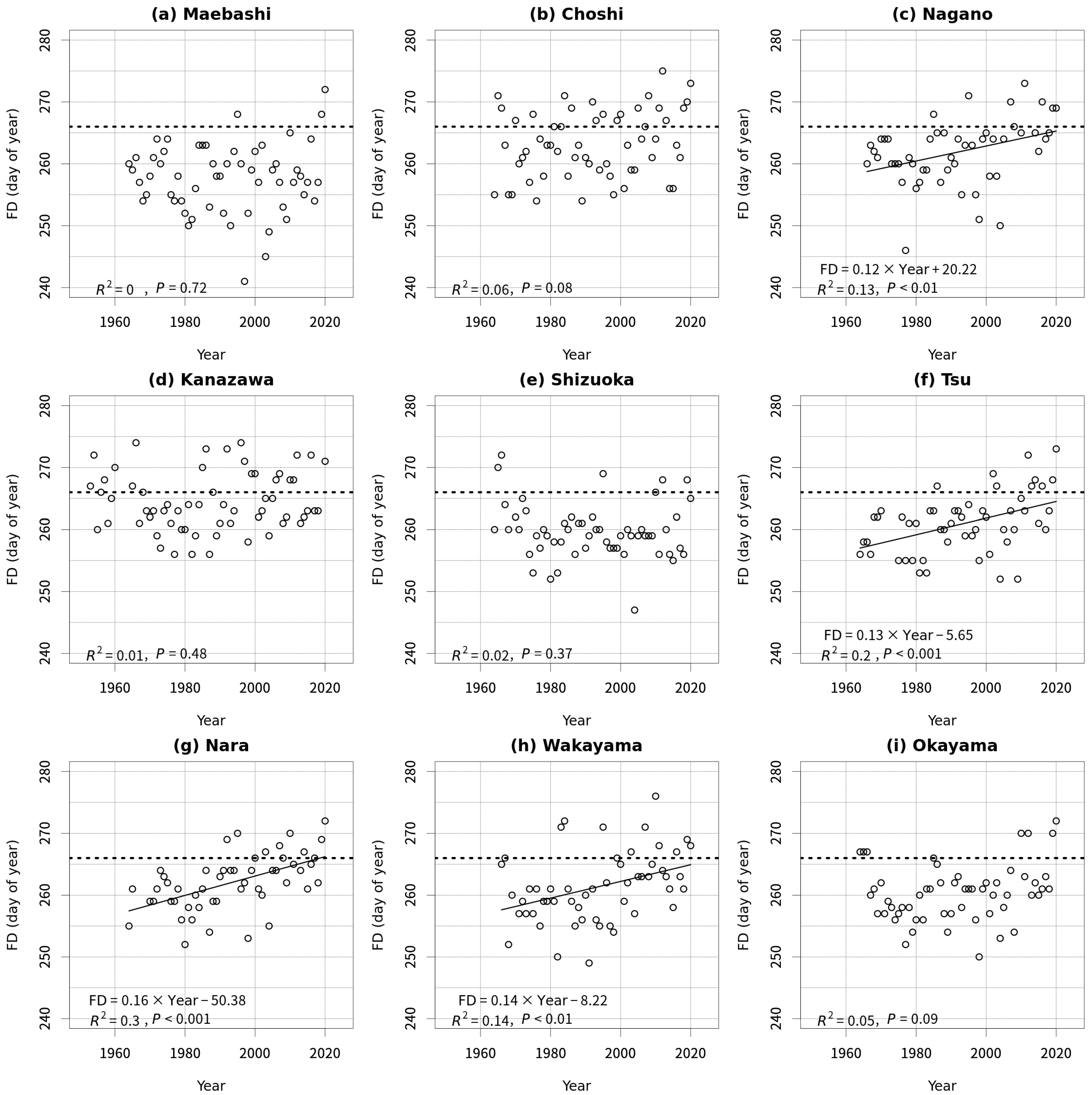 | Figure 5i | Okayama | y = 1.06x + 233.40 | 0.11 | t = 22.04, p < 0.001 | t = 2.55, p < 0.05 |