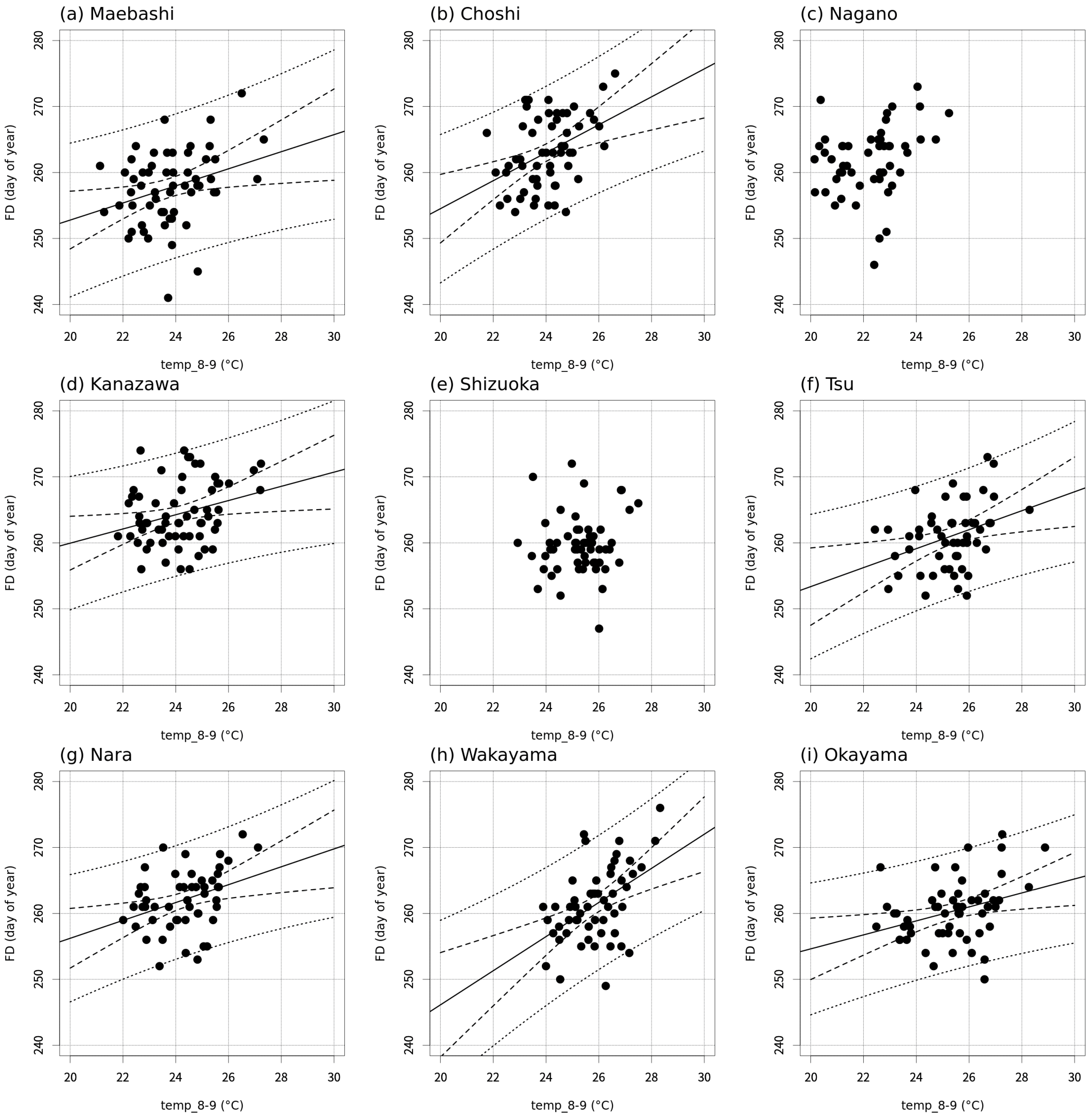 | Figure 5a | Maebashi | y = 1.30x + 226.90 | 0.09 | t = 17.50, p < 0.001 | t = 2.38, p < 0.05 |