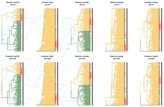 When samples are labeled by their original clinical classification (PsA patients vs. controls, top row; column “PsA” in the file “PsA_classes.csv”), all clustering methods produce groupings that do not correspond to the disease status. Similarly, when samples are labeled according to the ESOM-derived classification (bottom row), which identifies the subset affected by laboratory workflow variations (ESOM class “2”, marked in red; column “ESOM” in the file “PsA_classes.csv”), the clustering methods again fail to separate this group from the remaining samples (ESOM class “1”, marked in gray). This is particularly notable because the ESOM classification precisely identifies the 16 control samples processed in earlier batches with different laboratory workflows. In contrast to these conventional hierarchical clustering approaches, the ESOM method successfully detected and separated this analytical subgroup through its combination of emergent self-organizing map projection and subsequent density-based clustering on the resulting U-matrix [17].