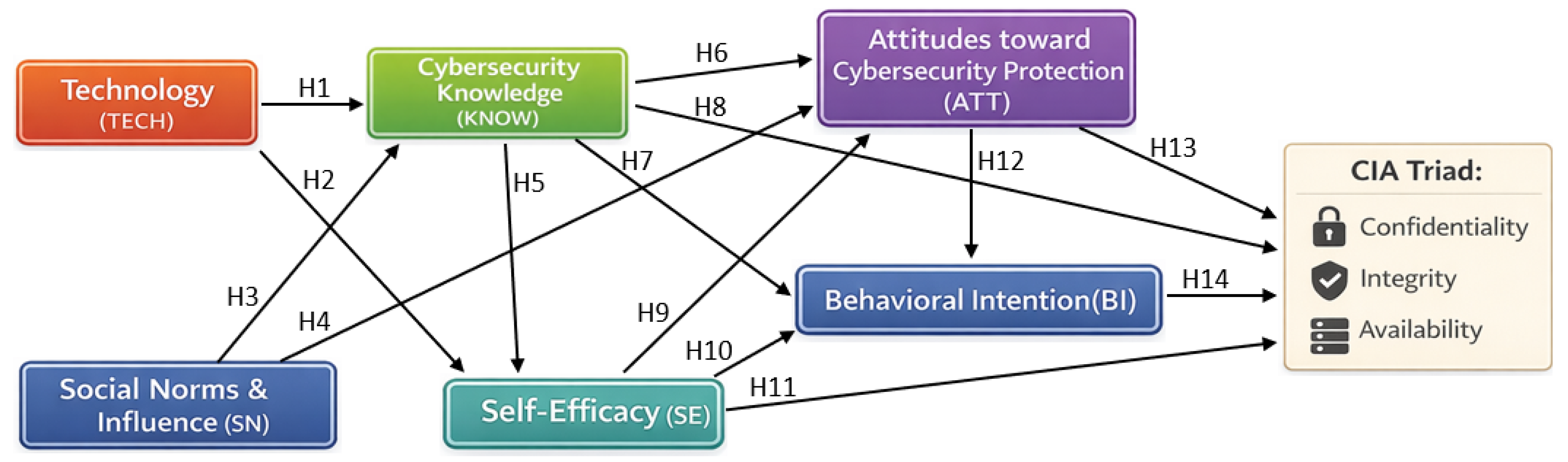 Integrating these perspectives, the proposed framework conceptualizes cybersecurity protection as a layered behavioral system. Technology exposure (TECH) and Social Norms & Influence (SN) function as contextual drivers shaping Cybersecurity Knowledge (KNOW) and Self-Efficacy (SE). These cognitive resources influence Attitudes (ATT) and Behavioral Intention (BI), with enacted protection ultimately reflected in confidentiality, integrity, and availability (CIA).