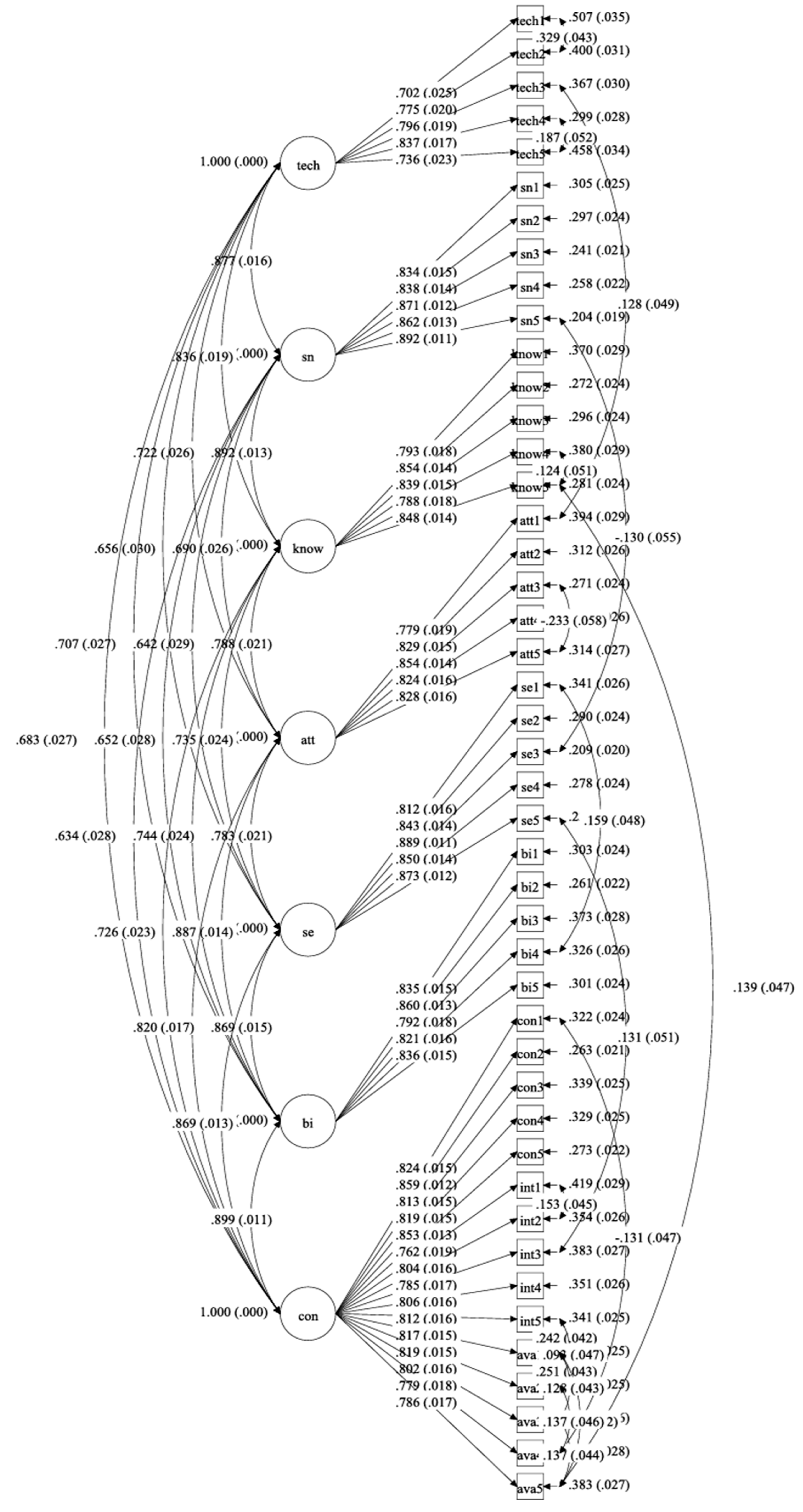 3.6. Attitudes (ATT), Behavioral Intention (BI), and CIA
