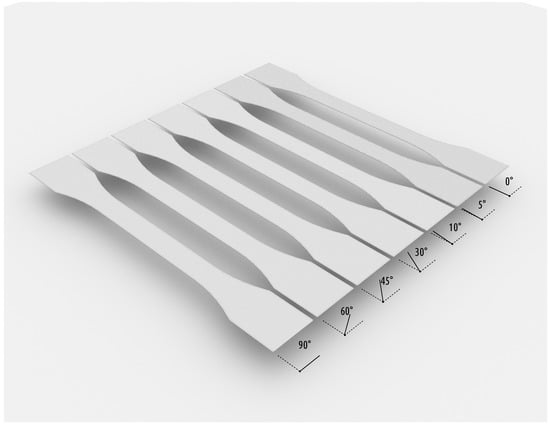 Additive Manufacturing (AM) or 3D printing [] is the method of creating physical objects from digital models by usually layer-wise fabrication. This term comprises various technologies used to create the physical objects [,] ranging from Laminated Object Manufacturing (LOM), Selective Laser Sintering (SLS) or Selective Laser Melting (SLM), Stereolithography (SLA) to Fused Deposition Modeling (FDM) (or Fused Filament Fabrication (FFF) []). Objects can be created using a range of materials like plastics (Thermoplastics or Photopolymers), Ceramics, Waxes, Metals and Alloys dependent upon the underlying technology. Due to the nature of the fabrication process the digital Computer Aided Design (CAD) model must be transformed to a machine code file []. For this step the digital model is transformed into an exchange format like StereoLithography (file format) (STL) or Additive Manufacturing File Format (AMF) [] which is then processed by a software that is called a slicer. The slicing software creates layers or cross-sections through the object under the influence of user-selectable parameters that is then traced by the machine-code. The quality of the resulting object is dependent upon the quality of the slicer []. In FDM [] a thermoplastic like acrylonitrile butadiene styrene (ABS) polylactic acid (PLA) is heated to above the glass-transition temperature within the extruder to a semi-molten state and then pushed onto the build plate or previous layers of the printed object, where the extrudate solidifies due to the reduced temperature []. This research is conducted to test the hypotheses that the build orientation and the infill pattern of a part influence the mechanical and geometrical (see Section 1.1) properties of said part. For this research we have created a set of infill patterns ranging from 0 to 90 degrees (0, 5, 10, 30, 45, 60 and 90 degrees, see Figure 1), where the angle indicates the orientation of the strands within the specimen against the X-axis which is the front of the build plate, see Figure 1. The experiment is designed to print the varying infill patterns with and without orientation of the object in alignment of the infill pattern. The specimens are printed with a layer height of 0.3 mm and a two layer design. The second layer is oriented either identical to the first layer or mirrored to the first layer. For this experiment the following four groups are created for each of the infill patterns: