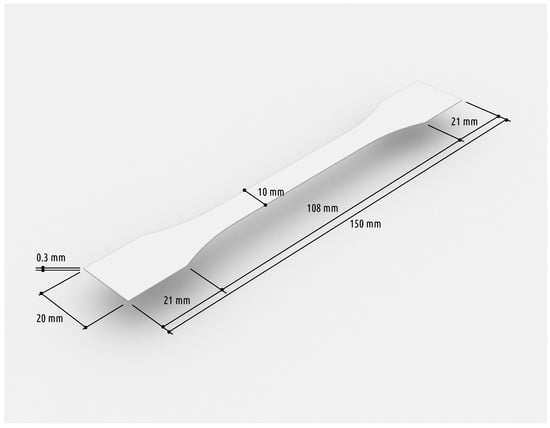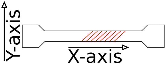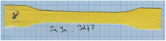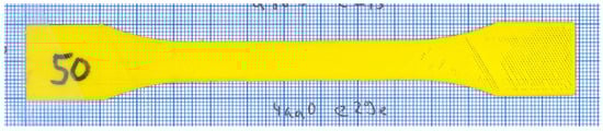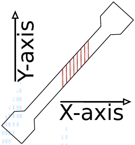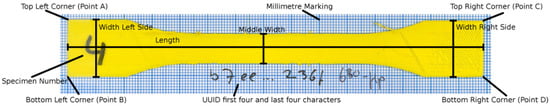 The experiment uses a model derived from EN ISO 527-2:2012 [] for structural testing of plastic based specimen with the deviation of object thickness that is reduced to 2 layers of 0.3 mm each. See Figure 9 for a reference of the object geometry. The unprocessed image data is provided as an example in Figure 10 for specimen 50.