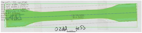 An overlay enriched image is created by the software that includes information on the filename, the measured distances (length of object measured from the top corners and along the longest axis of the object; width of object at the left and right side; width of the object in the middle), its orientation, the angle of the enclosing ellipse and the deduced infill pattern in degrees. Furthermore, this overlay image highlights the detected object and places a bounding box as well as a box through the corners of the object as an overlay. Further information is extracted and stored in a text file where each line is associated with a datum. These data are described in Section 3. See Figure 8 for an example of the result of the software processing with the overlayed information on the original image data.