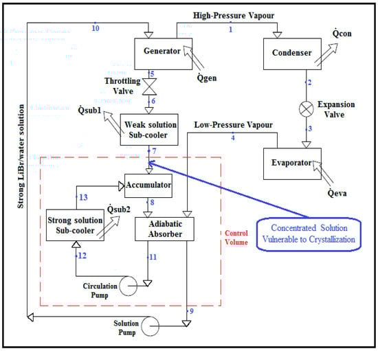 Schematic diagram of a LiBr/water (lithium–bromide/water) absorption refrigeration system equipped with an adiabatic absorber [].