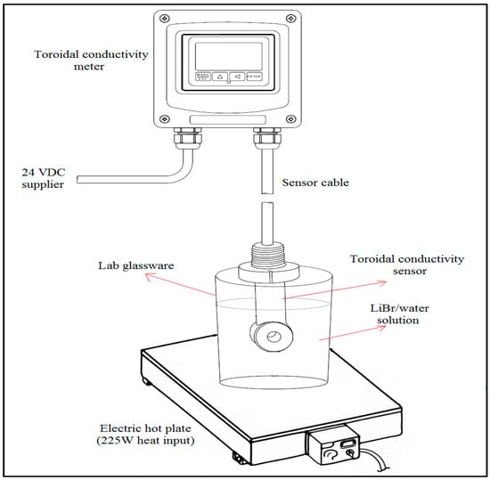 The aqueous lithium–bromide solutions were prepared in a mass percent concentration of 45%, 50%, 55%, 60%, and 65% by using distilled water and lithium bromide salt (with a purity of 99.0% according to the technical specification of the supplier). The solution preparation and the tests were performed in a dry laboratory room, and the amount of each LiBr/water concentrated solution was about 1.5 liters. During the experiments, the solution was placed in lab glassware over an electric hot plate at an input capacity of 225 W. At the center of the glassware, the submersion toroidal conductivity sensor (Omega Engineering, Model No. CDE-45T2) was mounted and connected to the toroidal conductivity meter (Omega Engineering, Model No. CDTX-45T), which was powered by 24 V DC supply as shown in Figure 2. The temperature and electrical conductivity measurement ranges of the instrument are from to 210 and from 0.0 mS/cm to 200.0 mS/cm with 0.5% accuracy for both measurements. For each of the five solutions listed above, six tests were performed; in tests 1, 3, and 5 the solution temperature was raised slowly from room temperature (25) to 95 using an electric heater, while in tests 2, 4, and 6, the solution was allowed to cool naturally from 95 to room temperature.