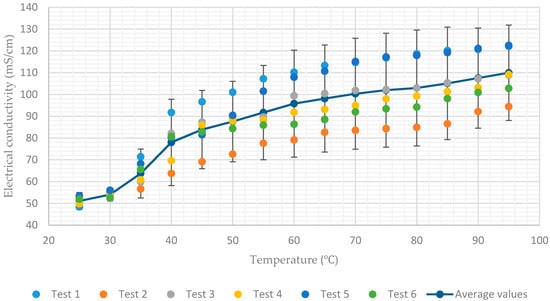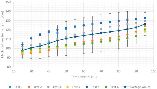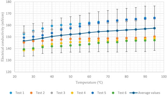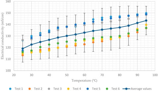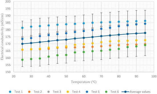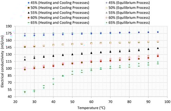 Additionally, Figure 7 shows a rapid decrease in conductivity when the temperature of the solution having a concentration of 65% approaches 40. This coincides with the onset of crystallization of the lithium–bromide from solution. As a result, the average values of electrical conductivity decrease rapidly from 78 mS/cm to 51 mS/cm when the temperature decreases from 40 to 25. In all charts, for each solution concentration, average values of the six tests and error bar corresponding to two sample standard deviations (95% confidence interval) were plotted. In practice, the confidence intervals are typically stated at the 95% confidence level so that the result has only a 5% chance of being false [].