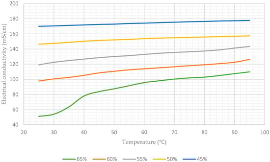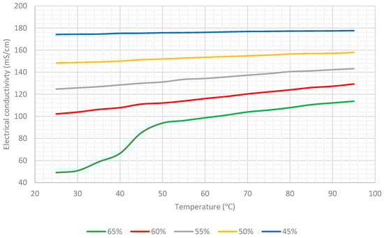 Table 1 lists the average values of the electrical conductivity of the aqueous lithium–bromide solution for concentrations of 45%, 50%, 55%, 60%, and 65% at various temperatures, and Figure 8 shows this data in graphical form.