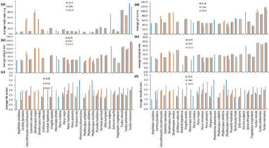 Selected traits of the most common bird species in the three Biodiversity-Exploratories in 2014 and 2015; ALB: Schwäbische ALB in the southwest, HAI Hainich-Dün in the center, and SCH Schorfheide-Chorin in the northeast of Germany. (a) Average body mass in grams; (b) average wing length in mm from tip to bow, flattened; (c) average fat scores (following [28,32]); (d) average length of primary three (counted from outside) in mm; (e) average tarsus length (back of the intertarsal joint to the bend of the toe at the metatarsal joint [28] in mm); (f) average muscle scores (following [28,32]).