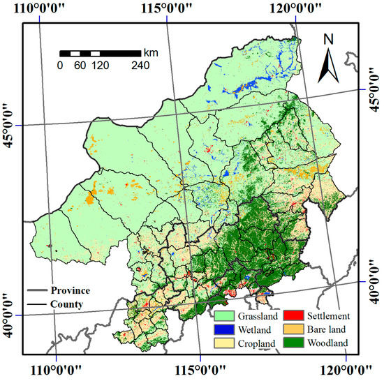 In this context, an archive of fractional cover of PV and NPV was computed for the Beijing and Tianjin Sandstorm Source Region (BTSSR), with monthly temporal resolution covering 2001 through 2015, and a spatial resolution of 500 m. The BTSSR—including 75 counties in Beijing, Tianjin, Hebei, Shanxi, and Inner Mongolia—has a total area of 458,000 km2, of which approximately 101,200 km2 is desertified, mainly in the Otindag and Horqin Sandy Lands, where land degradation has been attributed to overgrazing, excessive reclamation, deforestation, and climate change (Figure 1). The study area includes arid, semi-arid, dry sub-humid, and semi-humid climates, with an annual precipitation ranging from 200 mm in the northwest to 600 mm in the southeast.