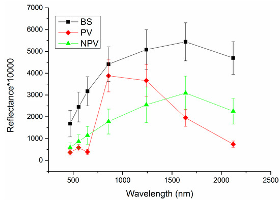 Endmembers are fundamental physical components that themselves are not mixtures of other components. Considering the coarse resolution of MODIS NBAR data, the average spectra of PV, NPV, and bare soil were utilized as the endmember spectra (Figure 2).
