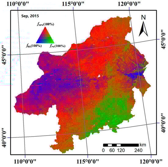 The algorithms for FCLS were transformed into IDL (Interactive Data Language) routines, based on which, all the fractional covers were produced. The fractional cover of PV, NPV, and BS in September 2015 are shown in Figure 3.