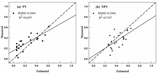 The validation results for fractional cover of PV and NPV were shown in Figure 4. Both fractional cover showed statistically significant correlations with observed data. Fractional cover of PV was with higher accuracy (R2 = 0.6297, RMSE = 0.2443) compared to NPV (R2 = 0.3747, RMSE = 0.2568). It is worth noting that the PV fraction was underestimated to some extent, while the NPV fraction was overestimated slightly, which could be caused by invariant endmember effects, scale, and time difference between field investigation and remote sensing data.