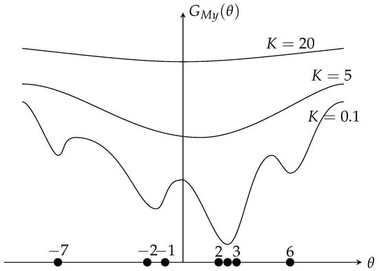 Plainly, as seen in Figure 1 (the sample set is ( x 1 , x 2 , , x 7 ) = ( 7 , 2 , , 6 ) , G M y ( θ ) is the myriad cost function) the larger the value of K, the closer the behavior of the myriad estimator to the linear estimator. While decreasing the value of K, the myriad moves away from the linear estimator to a more resistant estimator (in the limit case, the mode estimator, the optimal value towards the cluster ( 2 , 2.5 , 3 ) ). These properties made the myriad estimator a very powerful estimator.