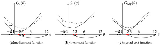 The Gaussian and Laplacian density functions lead to efficacious cost functions for the mean estimator and the median estimator as ρ ( x ) = x 2 and ρ ( x ) = | x | , respectively. The myriad estimator belongs to the M-estimator and is derived from the α -stable distribution using the cost function ρ ( x ) = log ( K 2 + x 2 ) , where the linearity tuning parameter K > 0 controls the impulse-resistance of the estimator (a more detailed description of K selection is given in Section 2.2). Given a set of samples x 1 , x 2 , , x N , the cost functions and the outputs for the linear (least square or mean), median, and myriad estimators are shown in Table 1.