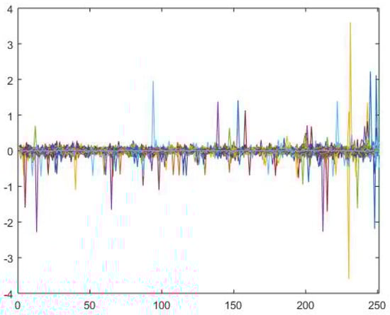 The data used in this example is daily price data of 2658 stocks from New York Stock Exchange (NYSE) in year 2015 (from January 1st to December 1st, 231 trading days), thus the return data matrix is 230 × 2658 . In this example, data was acquired from Wharton Research Data Services (WRDS) and analysis was programmed by MATLAB. The Log returns for each stock is show n in the Figure 5. As shown in the figure, most returns are in the range from 0.2 to 0.2 . However, since most stocks traded in NYSE are included in this example, some of them were not traded during the whole example period. Therefore, missing values and extreme returns exist, especially a few returns that exceed 1 (or 1 ). When using conventional SVD on the return matrix, those extreme values will highly effect the result. The consequence would be that the factors contain more idiosyncratic information (returns and risks). If the factor estimation is not accurate, the single stock risk analysis result will be highly effected. Thus, the robust method that can eliminate those effects of outliers is very necessary. Both conventional SVD and the MySVD ( p = 0.3 ) were applied to the same return matrix, and the results are shown below.