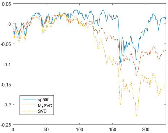 The mean square error (MSE) between the S&P 500 line and myriad robust line is 0.2149 , and the MSE between S&P 500 line and conventional SVD line is 2.0612 , that clearly shows that the robust market portfolio return is more close to the market return. Based on the two criteria and the discussion above, the MySVD outperforms the conventional SVD.