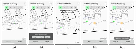 Five snapshots, in chronological order, of the interface of the Android application “TUT WiFi Positioning” used to collect the data. (a) initial position estimate; (b) aksing for estimation feedback; (c) selecting the correct floor; (d) selecting the correct location; and (e) notification of received feedback.