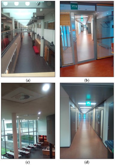 Environment of the measurements: example images at different floors of the building. (a) Main hallway seen from the second floor; (b) corridor partitioned by glass on the 4th floor; (c) restaurant area on the first floor; (d) corridor connecting different office spaces on the 3rd floor.