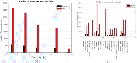 The distribution of the measurements per floor and per device type is shown in Figure 5, for the training and test data, respectively. Among the 21 measurement devices, six of them reported less than 10 measurement points, and four of them reported only one or two measurement points. This happens because, in addition to the volunteers from our research team, a few other anonymous volunteers tested the application with their devices, but probably stopped after one or a few points. From Figure 5, we notice rather similar distributions for training and test data. For example, most of the measurements were done at the first two floors (in both the training and the test data), and the least number of measurements was taken at the fifth floor, which was the least accessible. Furthermore, the highest number of measurements per device in both training and test data was done with a Letv-x600 device.