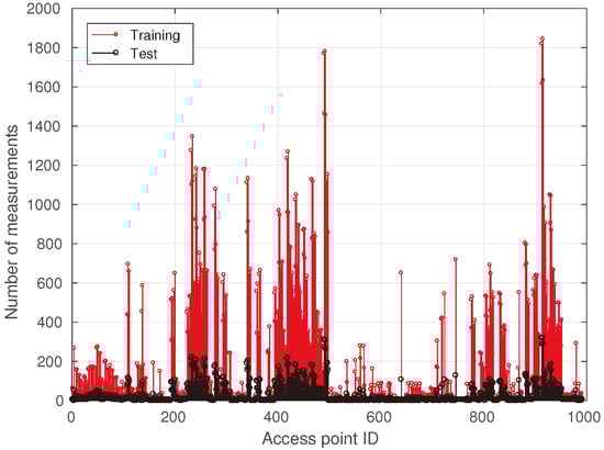 At the end of the measurement campaign, we detected 4648 fingerprints in the cloud database. These fingerprints were then split randomly and in a non-overlapping manner into 697 training fingerprints and 3951 test fingerprints, as shown in Figure 4, in order to enable indoor positioning studies. As seen in the figure, a few measurements were also taken outside the building, but close to it.