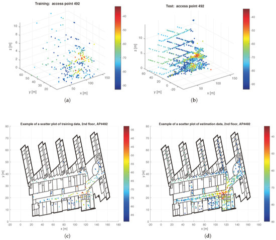 Examples of the 3D (up) and 2D (down) scatter diagrams (non-interpolated power maps) of AP 492. (a) 3D training data; (b) 3D test data; (c) 2D training data; (d) 2D test data.