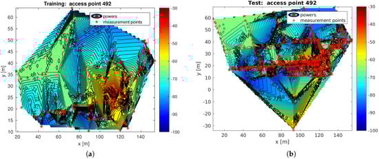 Example of interpolated power maps for Access Point 492 at second floor. (a) Training data; (b) test data.