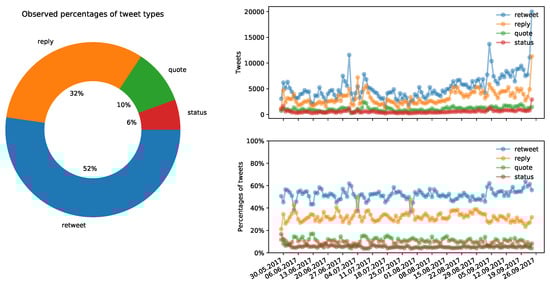 - percentages of tweet subtypes (status messages, re-tweets, replies, quotes),