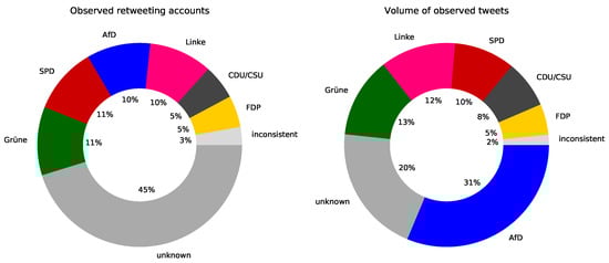 - If a Twitter user re-tweets no tweets of any political party, this user is assigned to the group ‘unknown’. This group contain voters where little can be derived from the re-tweeting behavior. Figure 3 shows that approximately 45% of all observed Twitter users can not be assigned to a political party simply by looking at their re-tweeting behavior. This share of “unknowns” might be reducible by applying more sophisticated natural language processing-based analysis of quotes, replies and status messages (which was not done for this dataset description).