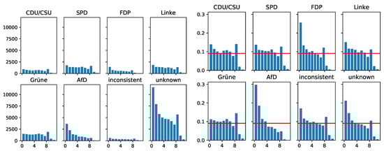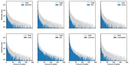 - Figure 6 shows that the reply behavior of re-tweeters of established parties like CDU/CSU, SPD, FDP, Grüne and Linke is comparable. However, re-tweeters of the right-wing populist AfD and the group of “unknowns” seem to dominate the reply space. It would be interesting to analyze whether these replies correlate with the postulated “hate-speech” phenomenon that was criticized mainly by established political parties during the election campaigns.