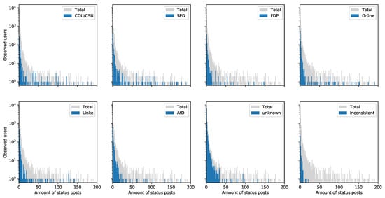 - Taking Figure 5, we see that only users with unknown party proximity tend to post slightly more status posts, but the status posting behavior seems quite comparable across all groups.