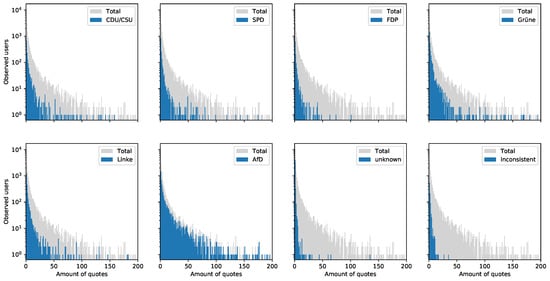 - Figure 7 visualizes the quoting loudness and clearly indicates that quoting is substantially done by re-tweeters of the right-wing populist AfD. It would be interesting to determine whether quoting is used to discredit systematically other political positions. This would be a behavior that is meant to be specific for populist parties.