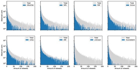 - To draw any conclusions for specific accounts is for the vast portion of this dataset statistically questionable. For instance, more than 75% of all observed users re-tweeted less than three times. To derive a party preference for a specific account on so few data is questionable. The dataset intends to enable deriving conclusions for the re-tweeted party, but not for specific re-tweeters. The reader should consider the following Section 4.2 to consider such statistical limitations.