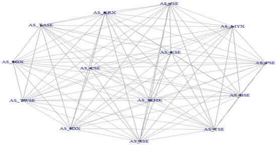 Complete weighted network of 14 Asian indices. Source: Complete weighted graph generated by employing the igraph package in R [60] and based on the author’s calculation of the weighted correlation coefficient as the weight for each edge. The network exhibited here is representative of one of the 151 temporally-synchronous observations. Each of the temporal observations is a sample of 500 data points. The symbols used for representing the 14 Asian indices are provided in Table 1.