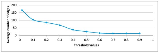 Plot of the average number of edges vs. the threshold levels of the weighted network.